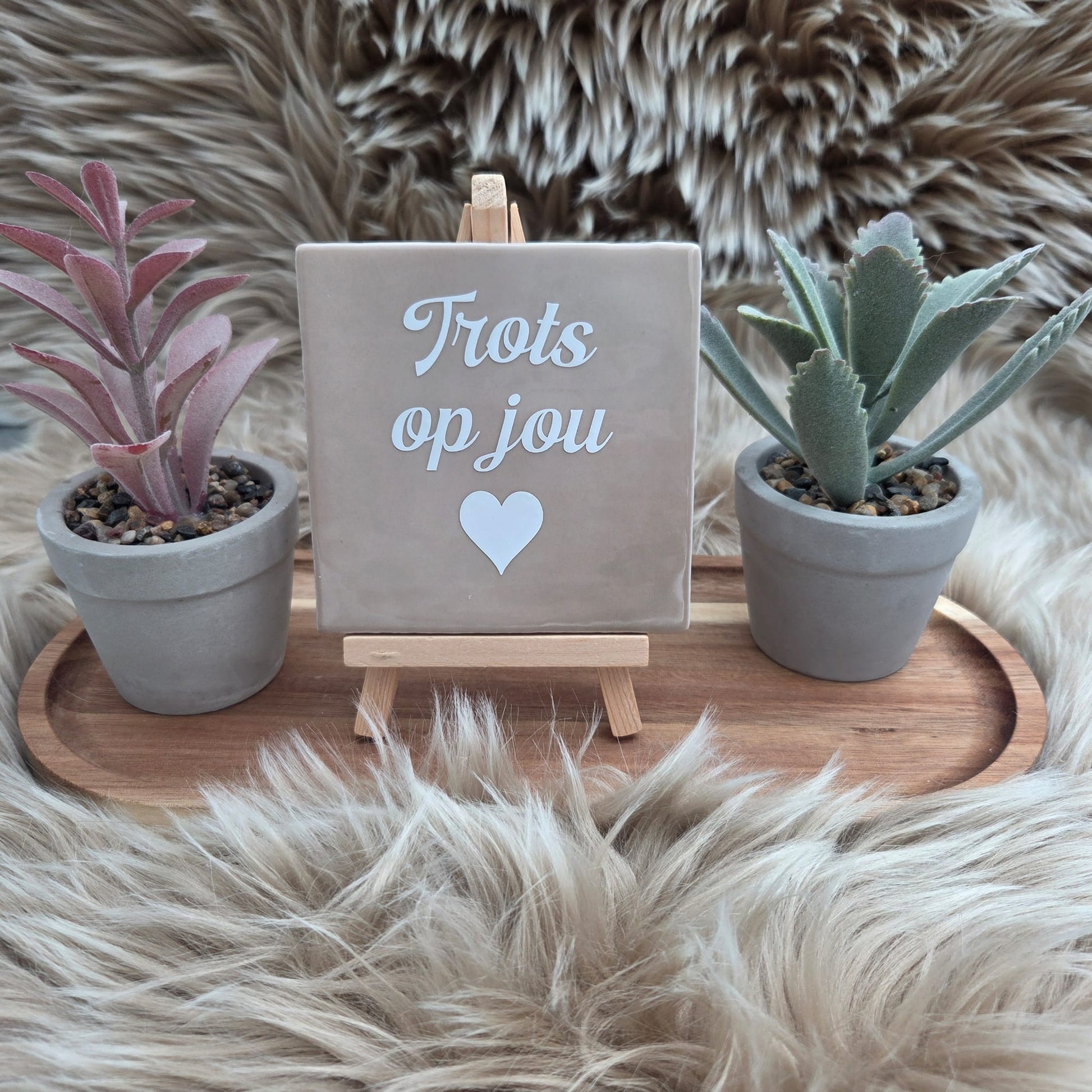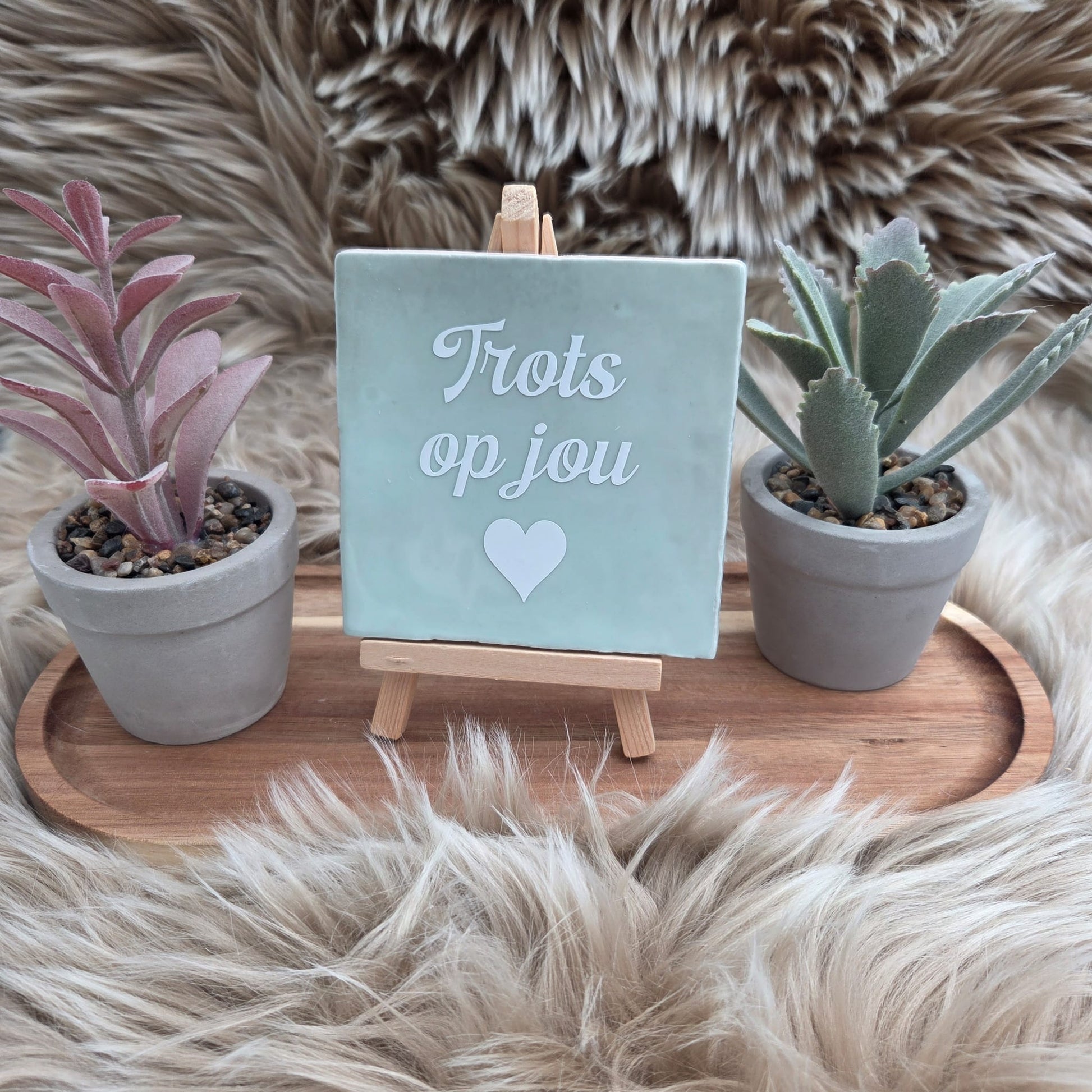Soms zegt een klein gebaar alles. Dit robuuste wenstegeltje met de tekst “Trots op jou” is hét perfecte cadeautje om iemand een hart onder de riem te steken of te laten weten hoe trots je op ze bent. Door de stoere uitstraling past het in elk interieur en straalt het pure waardering uit.