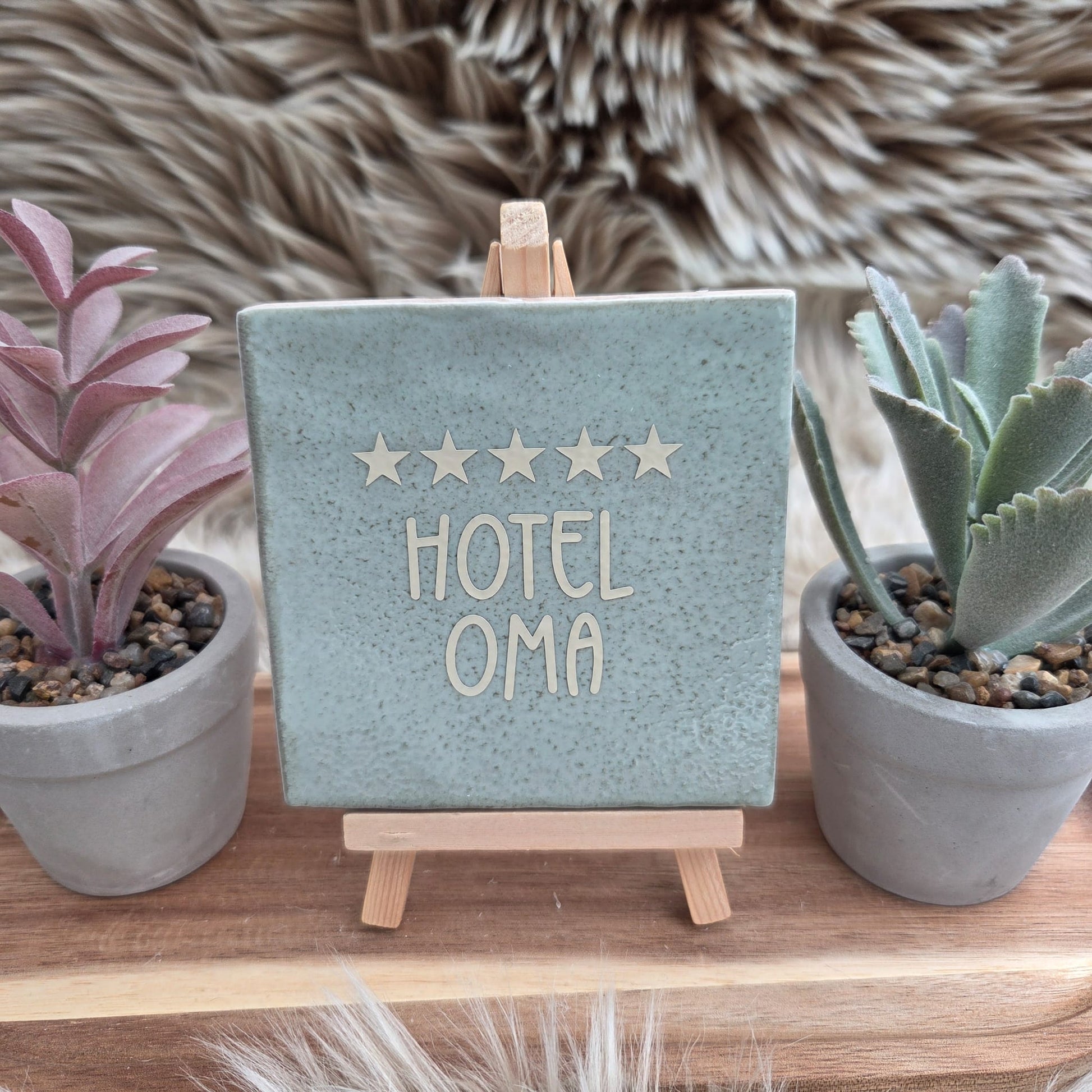 Geef dit humoristische tegeltje cadeau aan je moeder, oma of zet het neer als eye-catcher in huis. De tekst “Hotel Oma” met 5 sterren zorgt gegarandeerd voor een glimlach.