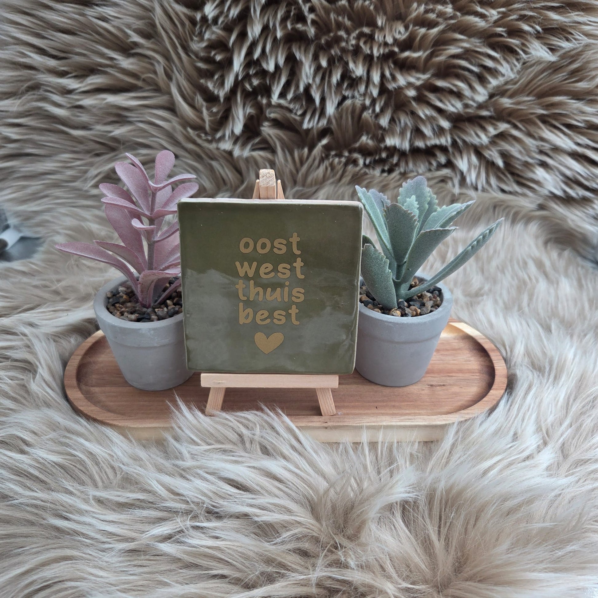 Deze klassieke spreuk “Oost West Thuis Best” op een keramische tegel brengt een warme en huiselijke sfeer in je interieur. Perfect als cadeau voor een housewarming of om je eigen huis op te fleuren.
