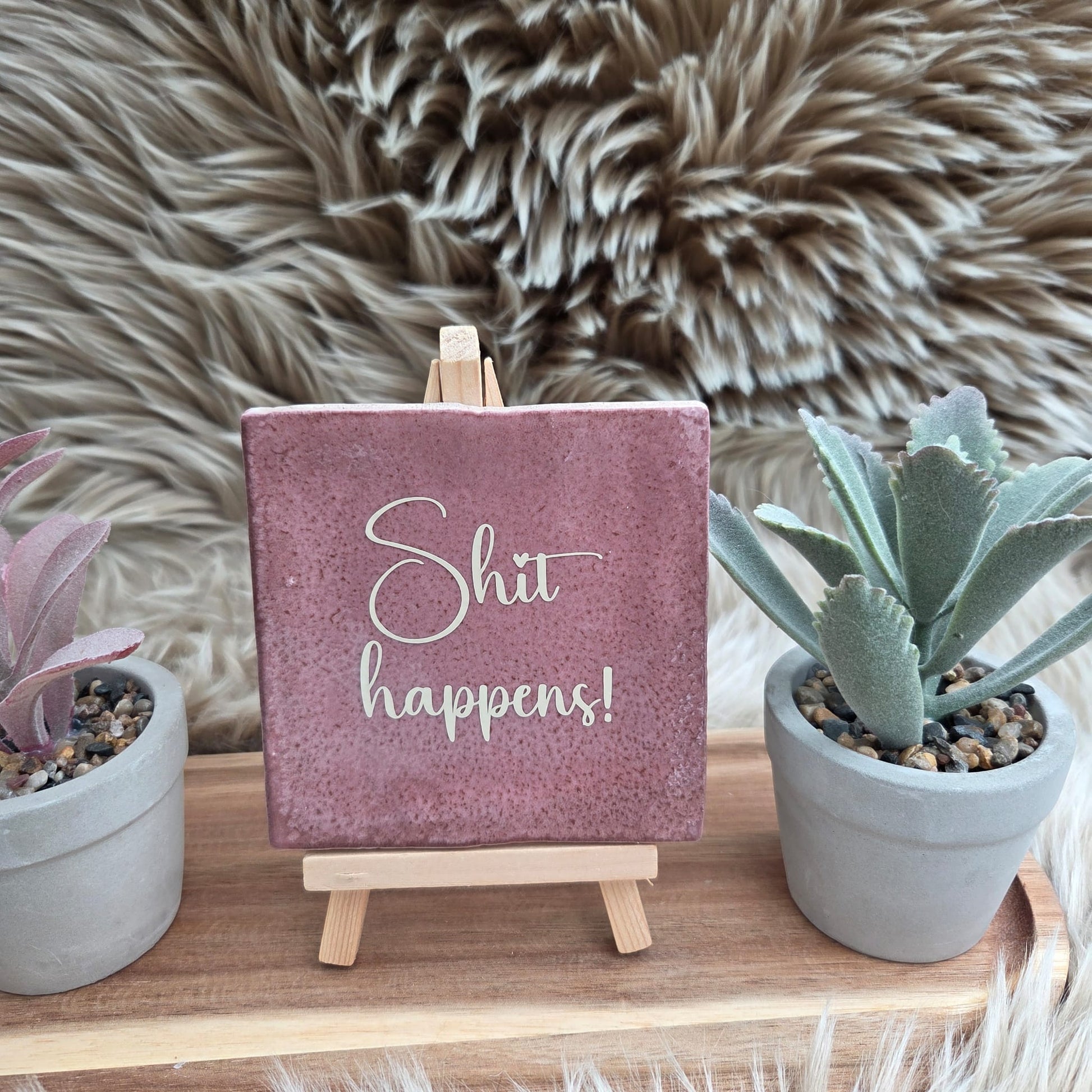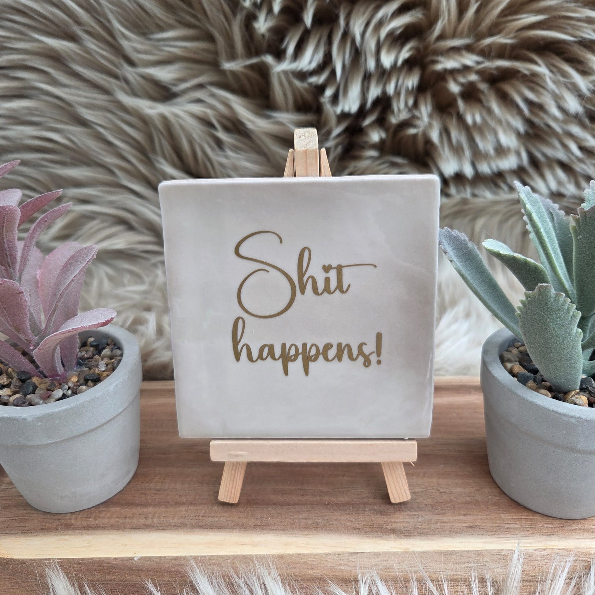 Dit robuuste wenstegeltje met de tekst “Shit happens!” brengt een knipoog en een vleugje humor in elk interieur.