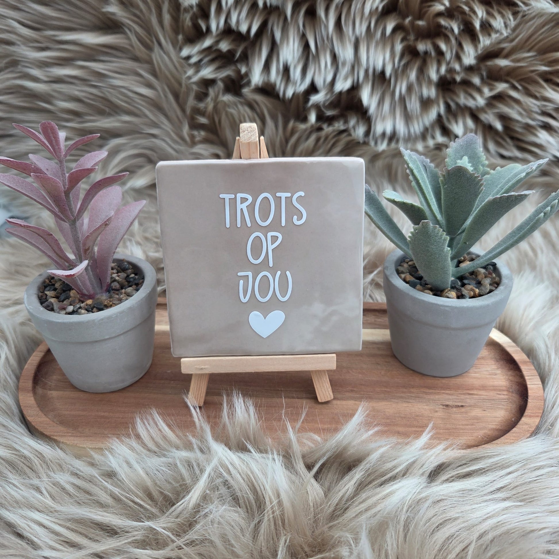 Soms zegt een klein gebaar alles. Dit robuuste wenstegeltje met de tekst “Trots op jou” is hét perfecte cadeautje om iemand een hart onder de riem te steken of te laten weten hoe trots je op ze bent. Door de stoere uitstraling past het in elk interieur en straalt het pure waardering uit.
