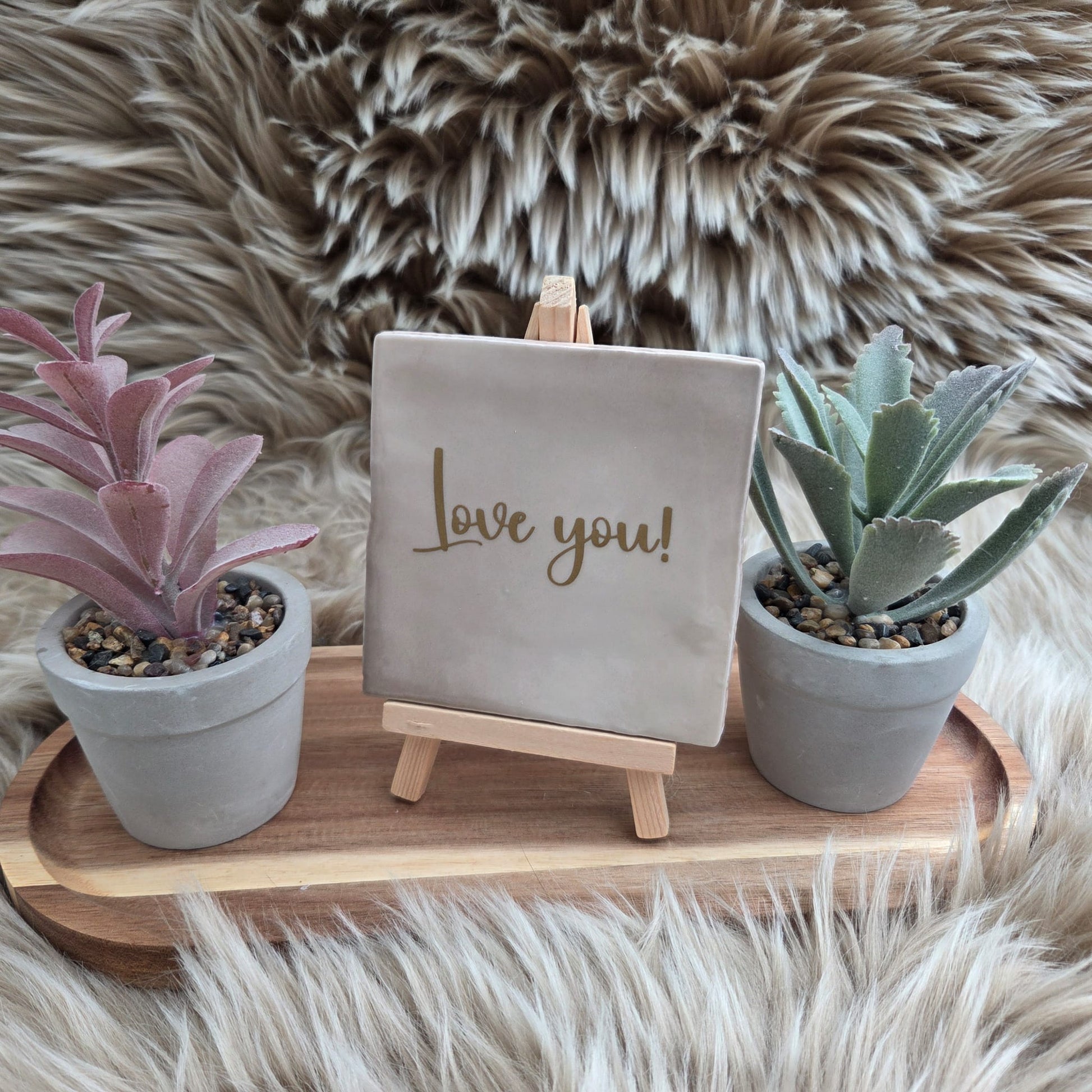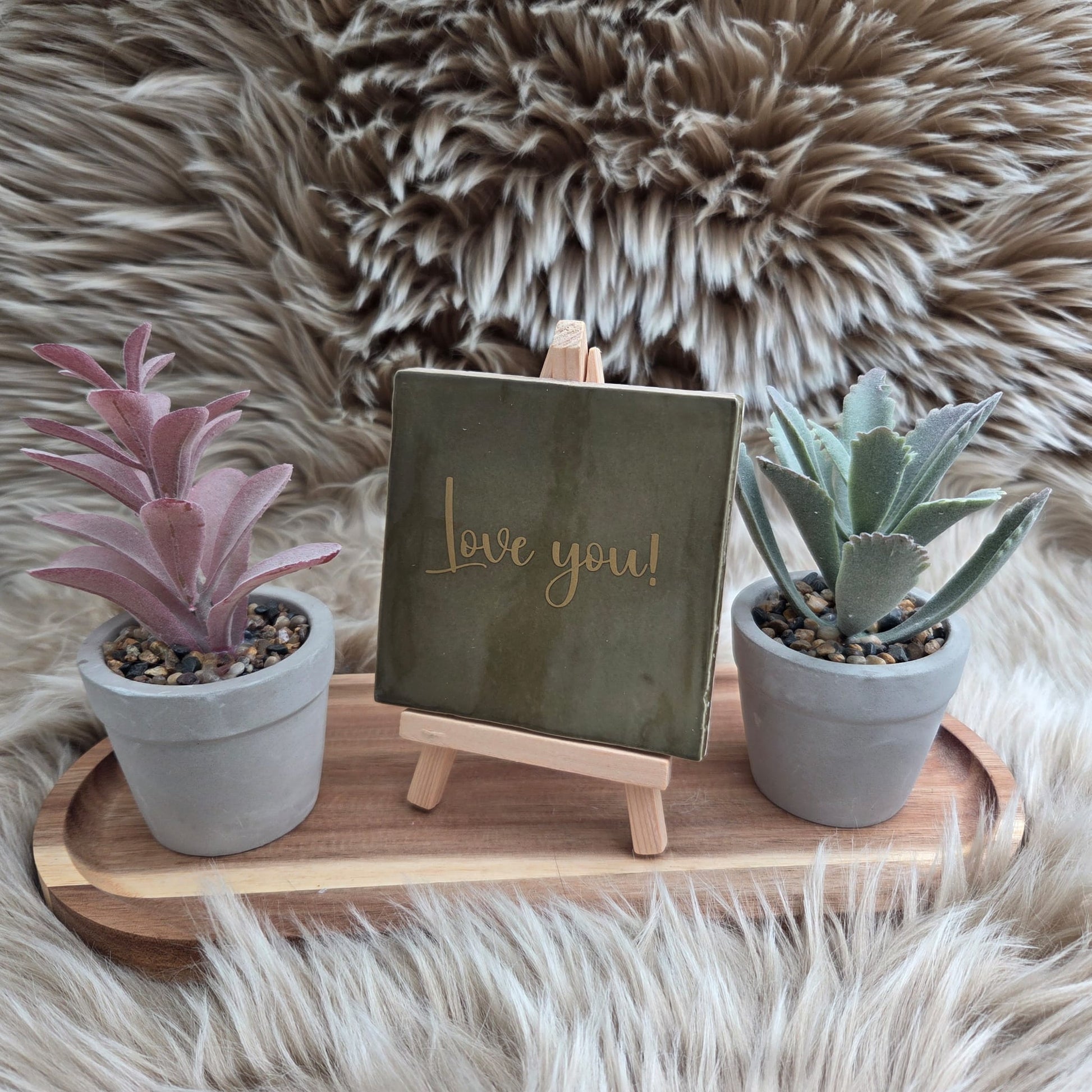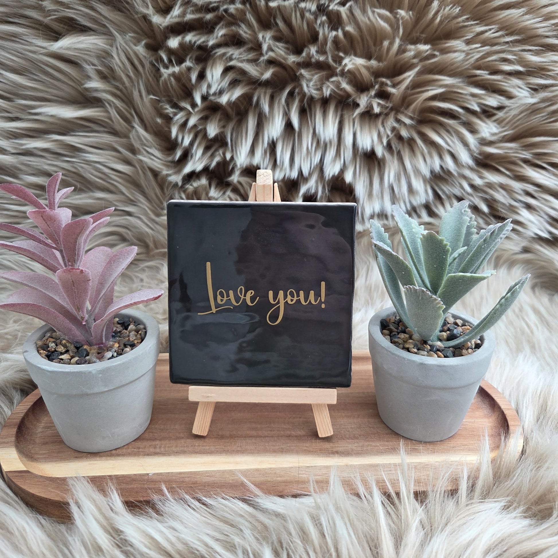 Deze stijlvolle robuuste tegel met de tekst Love You! is een prachtig en persoonlijke decoratie voor in huis. De luxe uitstraling maakt het een ideaal cadeau voor Valentijnsdag, verjaardagen, jubileums of gewoon om iemand te laten weten dat je om hem of haar geeft. Een warm en liefdevol woonaccessoire dat sfeer en emotie toevoegt aan elke ruimte.