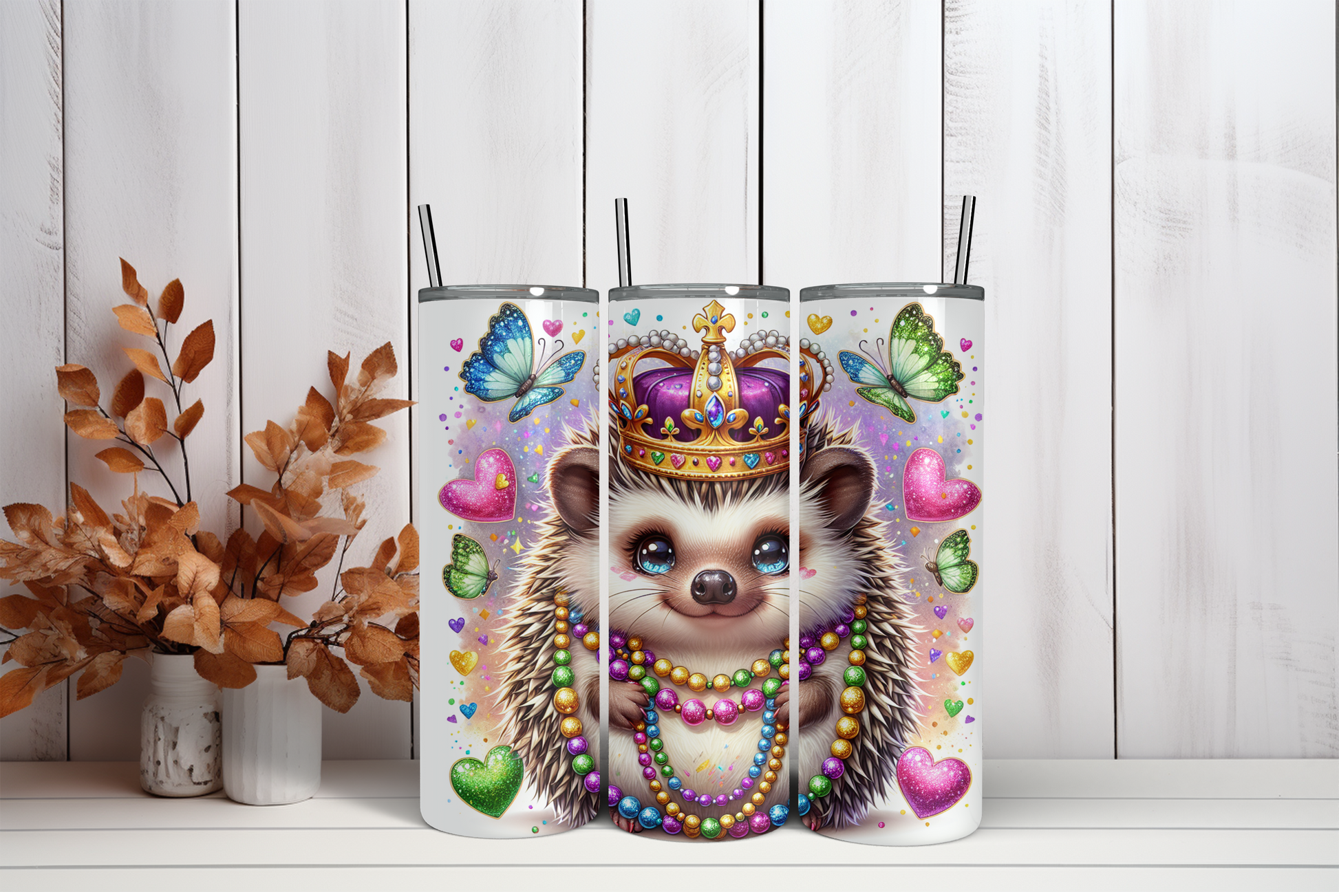 Maak je drinkmoment extra vrolijk met deze prachtige RVS tumbler van 600ml. Het kleurrijke design met een schattige egel, versierd met een kroon, kralenkettingen, vlinders en glitterhartjes, maakt deze beker een echte blikvanger. Of je nu onderweg bent, op school, op kantoor of tijdens een dagje uit – deze beker combineert functionaliteit met een speels en sprankelend ontwerp.