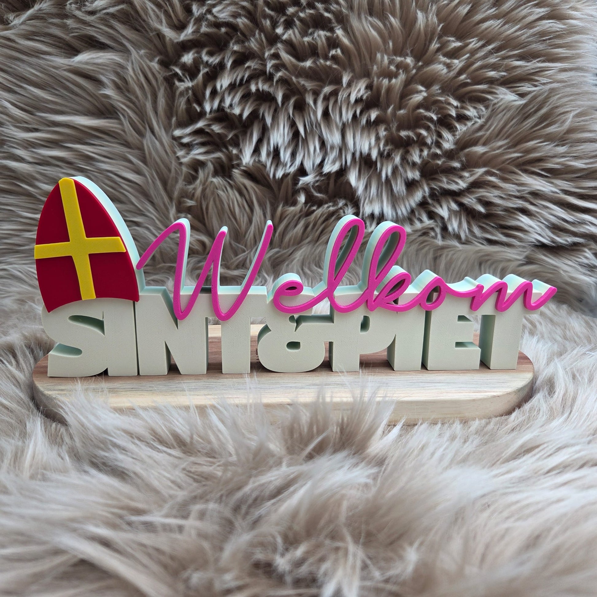 Heet Sinterklaas en zijn Pieten in stijl welkom met deze vrolijke 3D-geprinte “Welkom Sint & Piet” decoratie! 🎁